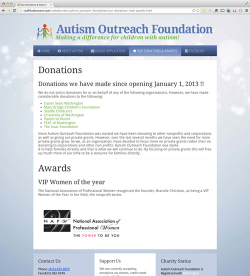 The Autism Outreach Foundation is a non-profit organization based out of Lynnwood Washington. They provide grants to low income families of children with Autism. I redesigned their site to help increase grant applications. The site is built using Joomla! and a customized theme from yootheme.com. You can view the live site here.